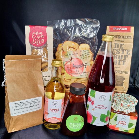 Dit cadeau pakket bevat het beste van de Betuwe. Heerlijke en eerlijke producten uit onze eigen streek. Geniet van alles wat de Betuwe te bieden heeft zoals appelchips, appelkersensap en perenjam gemaakt van fruit van De Woerdt. Of wat dacht je van Koekjes van Eigen Deeg? Heerlijk! Ken jij iemand die wel een beetje Betuwe kan gebruiken?